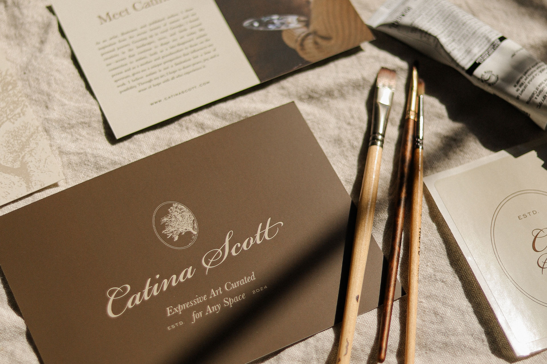 Catina Scott’s brand is a heartfelt blend of art, nature, and purpose—designed to create an inviting sanctuary where beauty and meaning intertwine. As an artist, her work captures the quiet elegance of nature and the warmth of vintage charm, bringing a sense of peace and connection to any space. To bring this vision to life, we developed a brand identity that reflects the depth and emotion behind her artistry, embracing earthy hues of deep browns, soft greens, and warm rusts. A harmonious mix of classic serif fonts and delicate script elements adds a sense of tradition and personal touch, while nature-inspired textures ground the brand in authenticity. Every detail was carefully considered to mirror Catina’s passion for storytelling through art, offering her audience a visual experience that feels both nostalgic and deeply comforting. The result is a brand that doesn’t just showcase art—it creates an emotional connection, inviting others to find solace and joy in pieces that speak to the heart.