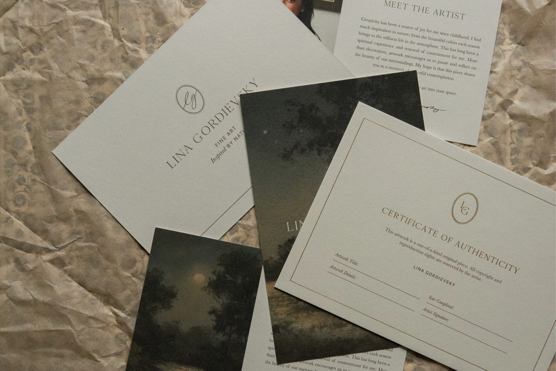 To authentically capture Lina Gordievsky’s exquisite fine art, we created a cohesive and sophisticated brand identity that mirrors her traditional, classic, and timeless style. The stunning color palette features deep browns, greens, cream tones, and an accented deep blue, evoking the vintage charm of her landscapes. We meticulously designed a full logo suite that aligns with her artistic vision. For the packaging, we prioritized the client experience, designing print care cards, meet the artist cards, packaging labels, custom tape, and authenticity certificates for original artworks. This meticulously crafted branding and packaging suite encapsulates Lina’s artistry, allowing her to present her work with elegance and sophistication, and fostering a deeper connection with her clientele.