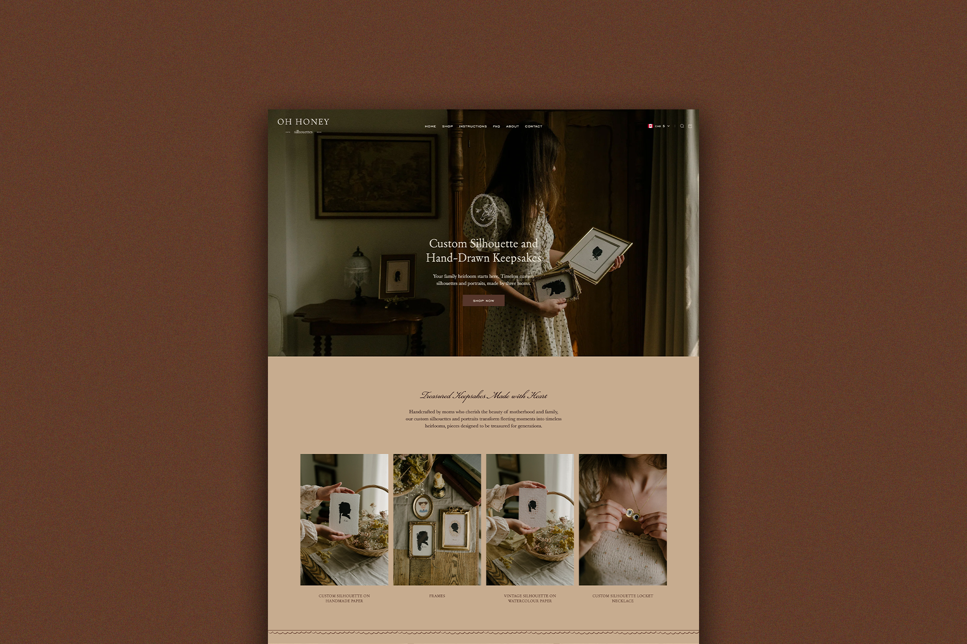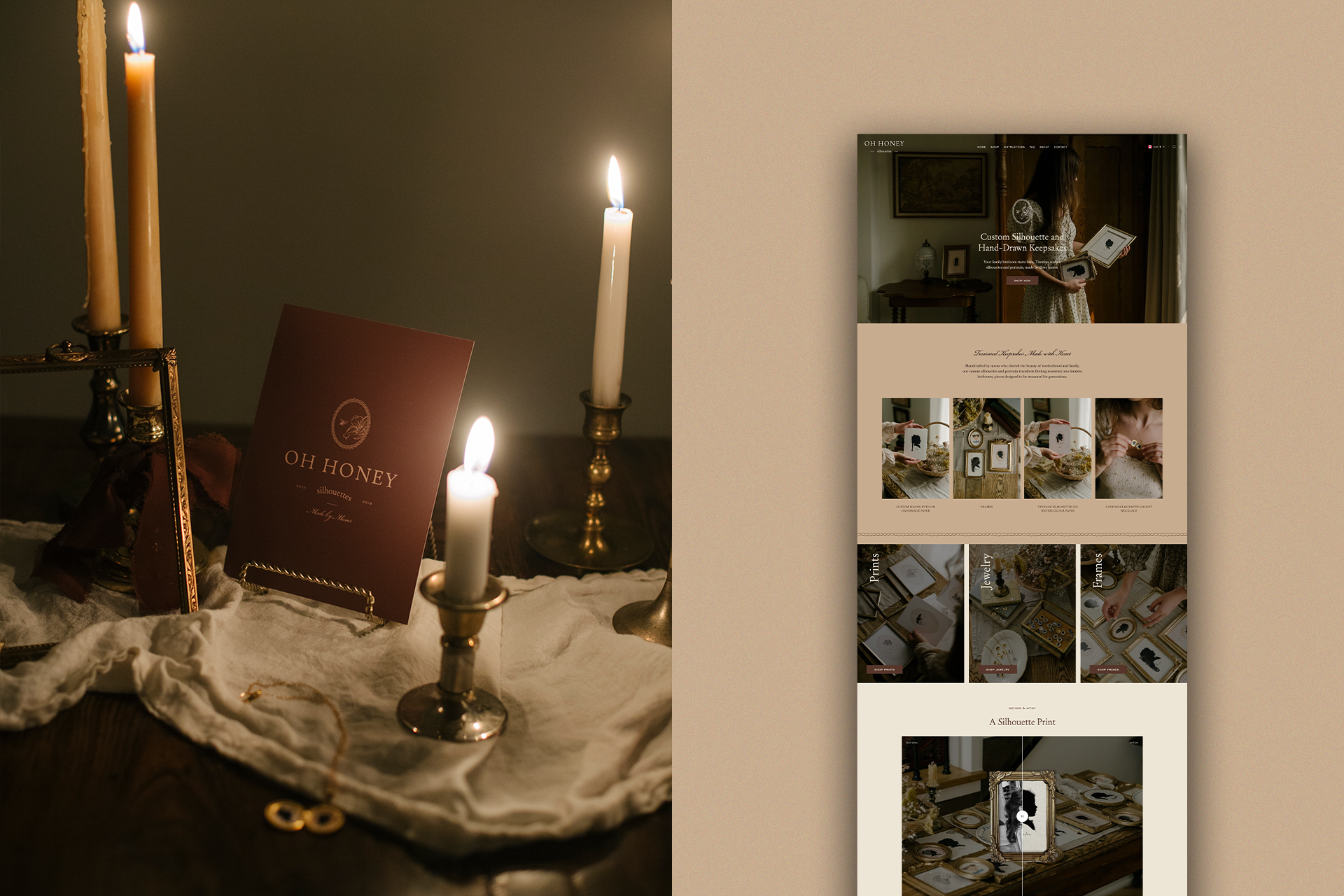 Oh Honey Silhouettes transforms cherished memories into heirloom-quality keepsakes, celebrating the timeless beauty of motherhood, childhood, and family connections. Rooted in vintage charm and whimsical allure, the brand evokes an ethereal, nostalgic atmosphere that feels both sentimental and refined. To bring their vision to life, we crafted a brand identity that reflects their commitment to quality and artistry. The warm color palette of muted greens, rich browns, and soft cream tones harmonizes with their handcrafted silhouettes and artwork, creating a visual experience that is as heartfelt as their offerings. We extended this cohesive aesthetic into print and packaging materials, designing content creator cards, thank-you cards, mailers, and jewelry care inserts, ensuring that every client touchpoint feels intentional and elegant. Oh Honey Silhouettes’ branding honors the art of storytelling, offering curated treasures that will be passed down for generations as enduring reminders of life’s most meaningful moments.