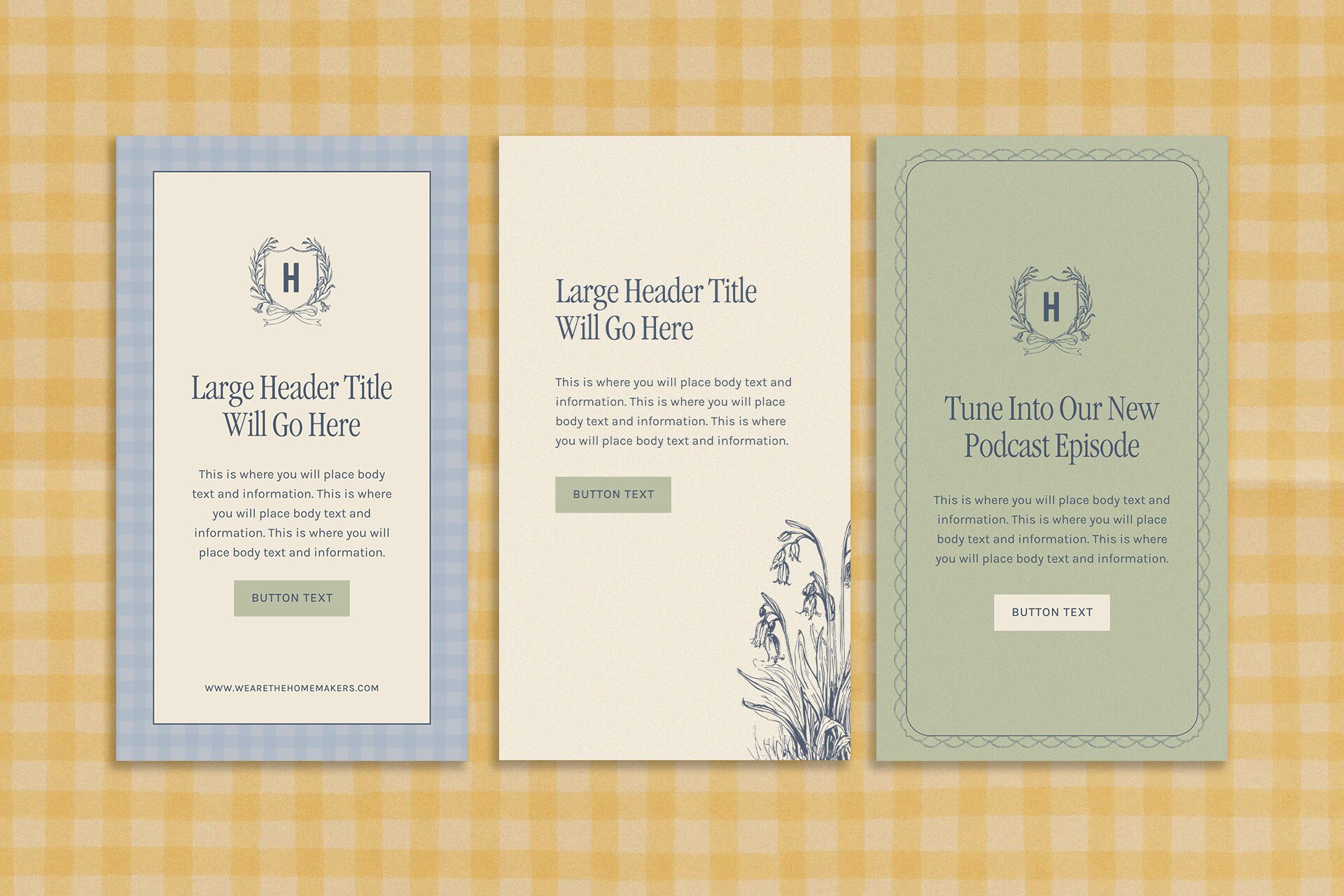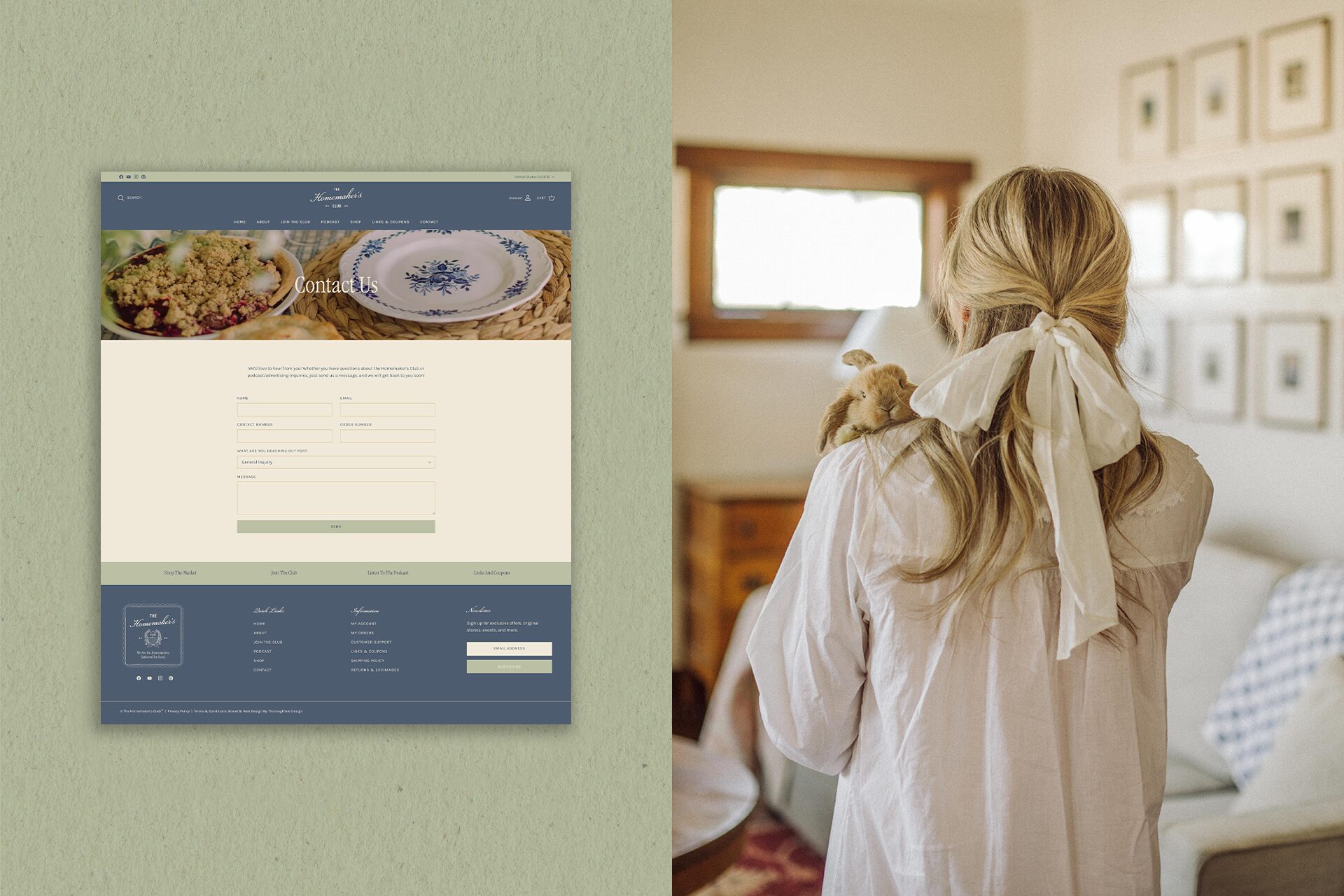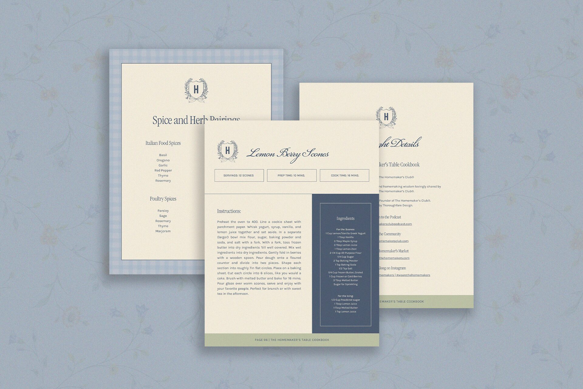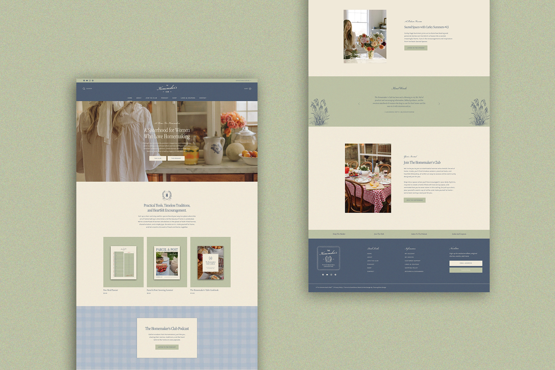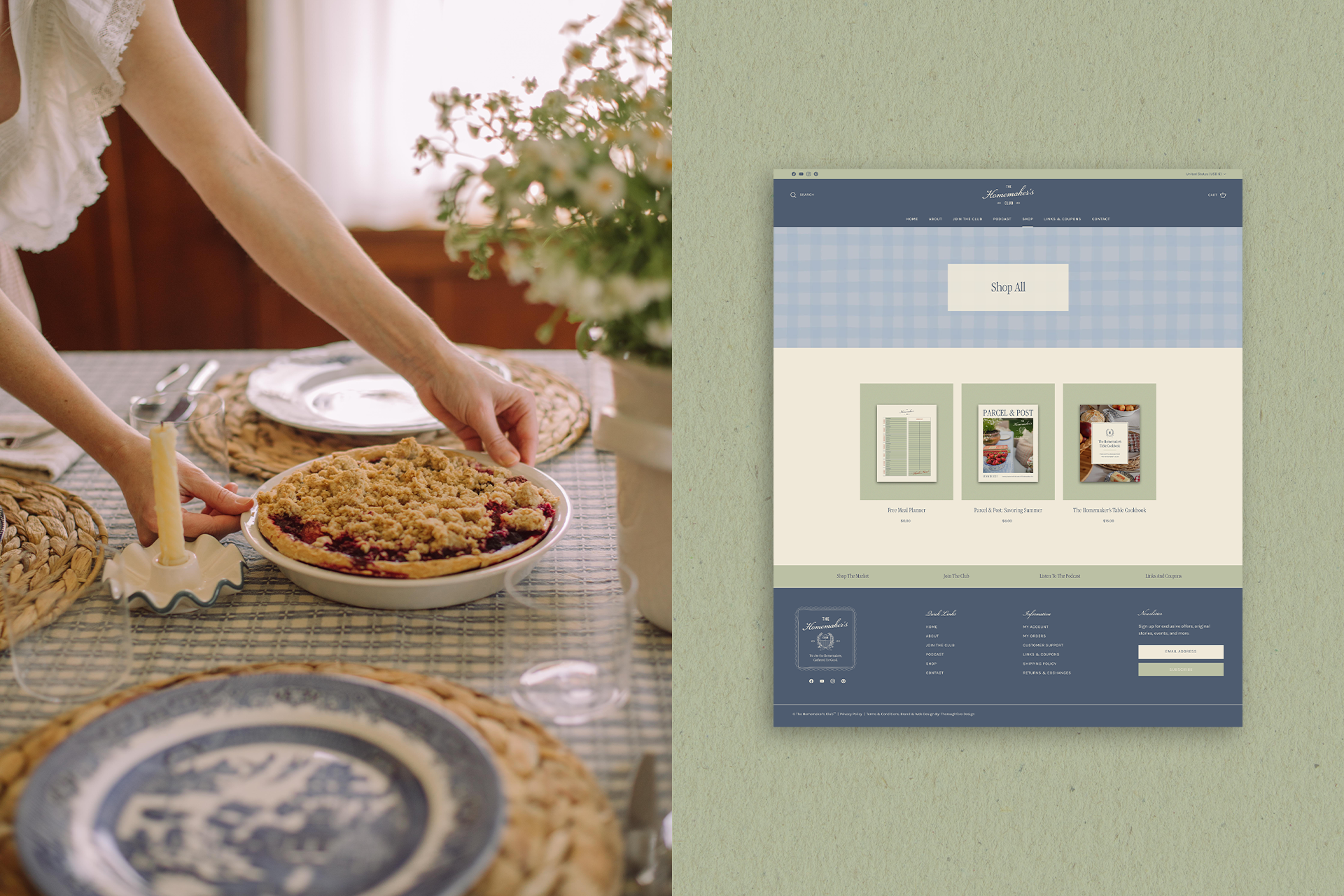 For The Homemaker’s Club, we developed a cohesive brand identity, along with print and digital collateral and a custom Shopify website. The vision behind this project was to create a brand that embodies a sense of sisterhood, centered around homemaking and the celebration of women and mothers. Through a collection of hand-drawn illustrations and a vintage-inspired crest, we brought to life a brand that blends a classic country club aesthetic with a warm, light, and welcoming feel. A thoughtfully curated palette of sage, navy, yellow, and soft blues is paired with gingham patterns, delicate florals, and imagery that captures the essence of slow, intentional living at home.