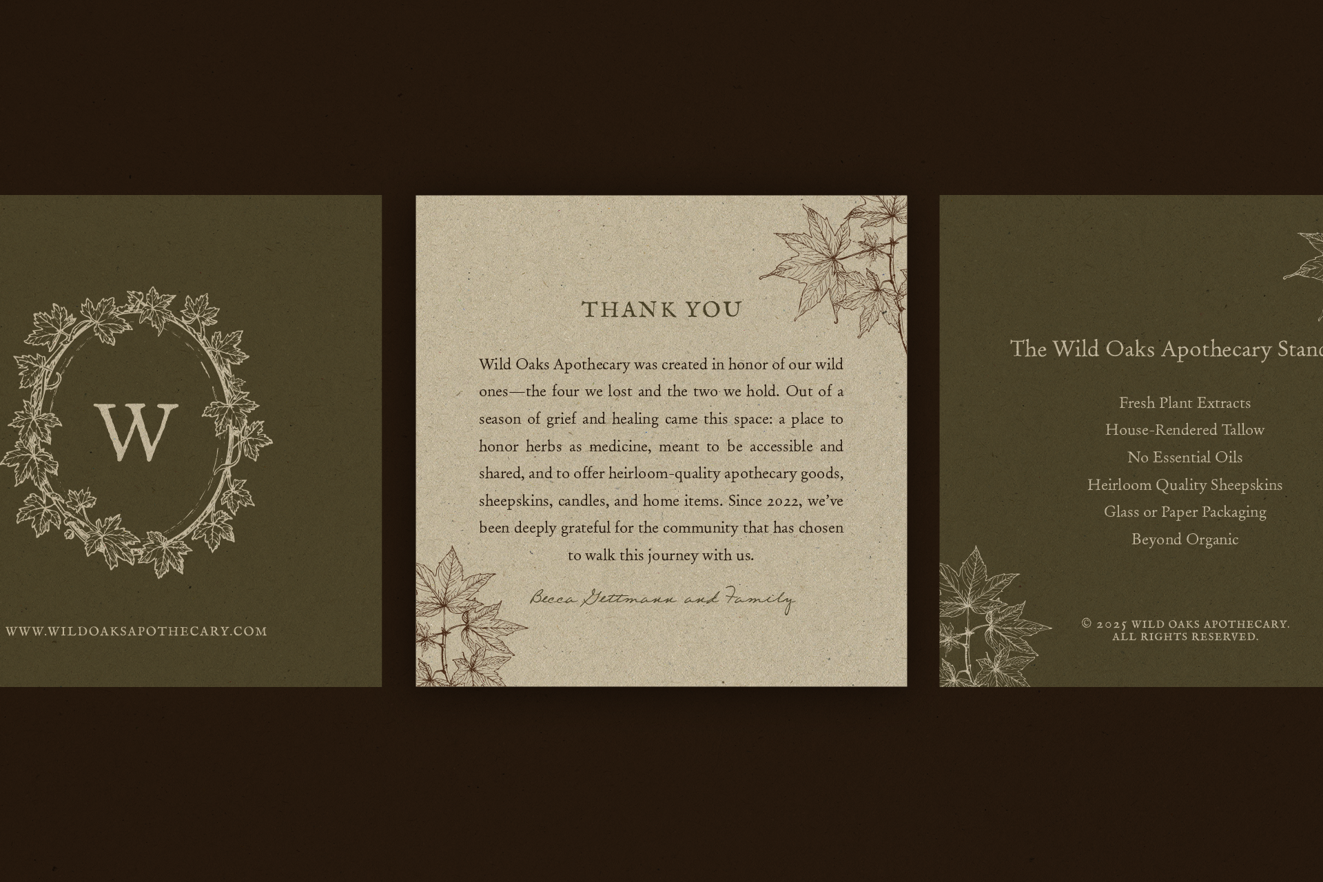The logo suite was crafted with deep personal meaning, featuring a vintage-inspired oval wrapped in hand-drawn maple leaves and vines, honoring both family and remembrance. A custom botanical brand mark built entirely from maple leaf forms and a timeworn serif wordmark nod to inherited knowledge and the founder’s love of old books. Extending beyond the core identity, we designed a full suite of illustrated product labels across the entire apothecary line, along with supporting print and digital materials that bring cohesion, clarity, and care to every touchpoint. The result is a brand that feels timeless, nurturing, and deeply intentional, offering more than products, but a sense of ritual, trust, and belonging.